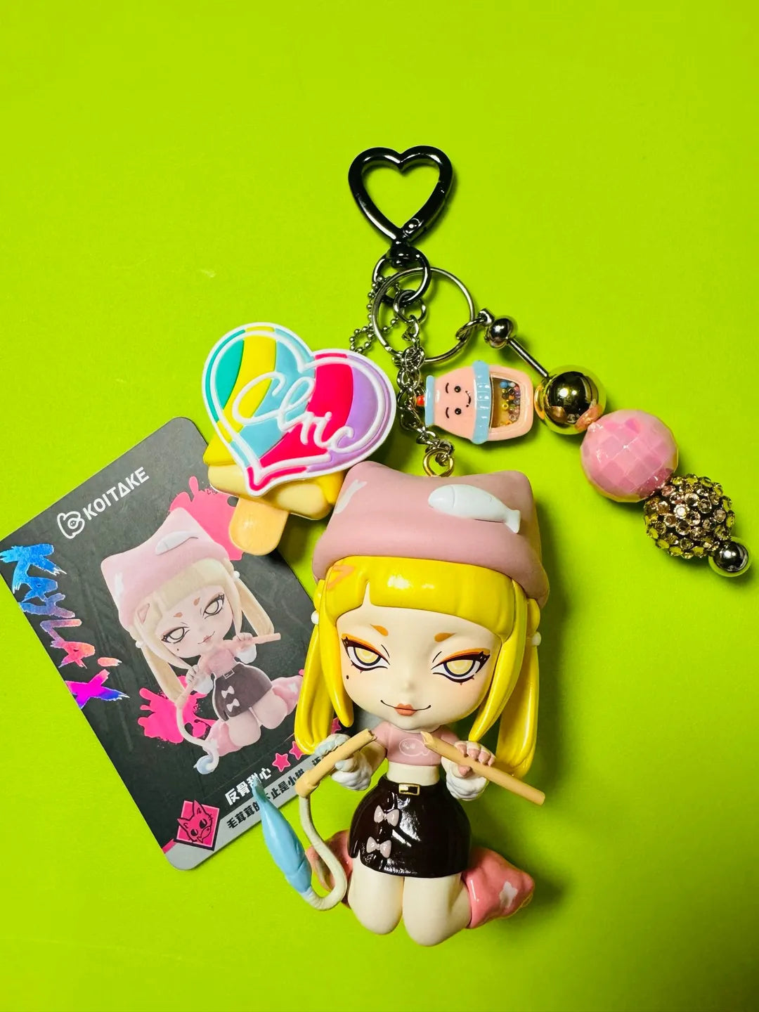 These blind boxes Koitake are soo cute. This one of a kind figure was customized into a keychain. Koitake will also come with the card and a lip balm